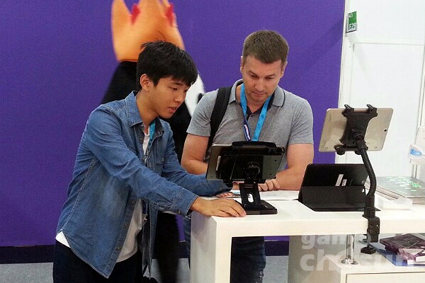 ▲ 게임스컴을 찾은 게임 관계자가 이들의 작품에 흥미를 보이며 게임 소개를 듣고 있다