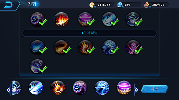 그리고 '매직리전'에서 유저, 즉 '리더 마법사'는 무려 100여 종이 넘는 마법 스킬을 사용할 수 있다. 마법 스킬은 크게 액티브와 패시브 계열로 나뉘는데 액티브 계열은 유저가 직접 사용할 수 있는 마법 스킬이며, 패시브 계열은 한 번 배우면 영원히 해당 수치가 상승하는 버프 스킬이다.