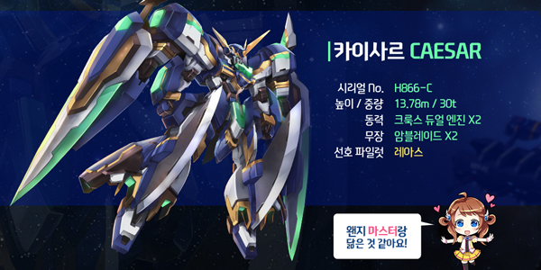 카이는 일단 잘생겼어요! 덩치도 늠름하고 칼을 휘두르는 모션도 멋있어요. 제가 조금 험하게 다루는 거에 비하면 잘 고장 나지도 않는 편이고요. 그리고 왠지 마스터랑 닮았어요. 어디라고 딱 짚어 말하긴 어렵지만, 비슷한 느낌이에요! 그래서 카이랑 싸우고 있으면 마스터랑 함께 하는 기분이라 든든해요. |