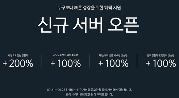 신규 서버에서 캐릭터를 생성해 플레이를 하면 사냥으로 얻은 경험치를 기존보다 200%, 사냥으로 획득한 골드 100%, 재집/제작 성공 시 숙련도 100%, 길드 경험치 및 영향력 100%의 추가 버프를 준다고 밝혔기 때문이다.