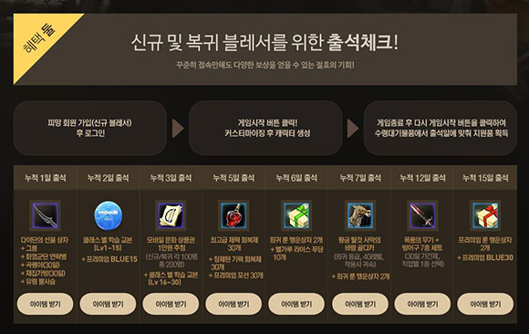 신규 및 복귀 유저는 이번 이벤트 기간을 놓치면 아쉬움이 클 것이다. 15일간 매일 게임에 출석하면 출석 일수에 따라 최고급 장비부터 프리미엄 상품, 고급 탈것과 장비 강화에 쓰이는 희귀 룬을 획득할 수 있는 이벤트를 진행하기 때문이다. 여기에 15, 20, 25, 30, 35, 40, 44레벨에 도달할 때마다 레벨에 맞는 고급 장비도 선물로 지급할 예정이다.