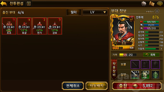 현재 조조전은 전투에서 승리할 때마다 VIP 레벨이 조금씩 오르는데, 내정 연구와 함께 하면 입수하는 것만으로도 13~15레벨을 노려볼 수 있다. 레벨이 오른 채로 등장하면 그 레벨 기준으로 알맞은 장비까지 맞춰 입고 등장하는 만큼 무작정 장수를 뚫기보다는 내정 연구와 VIP레벨을 올리면서 차차 얻는 것이 좋다고 생각한다.