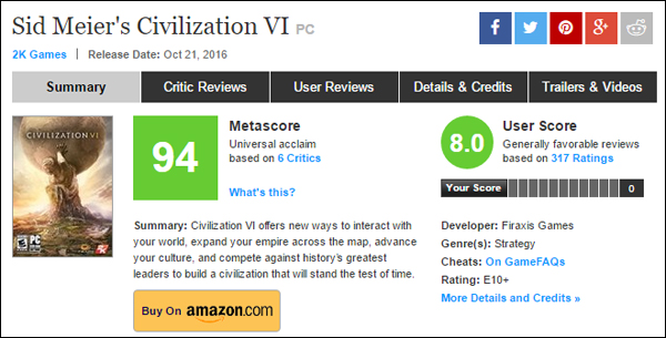 해외 게임 평가 사이트 중 가장 공신력이 높다고 평가되는 ‘메타크리틱’의 ‘메타 점수’에서 문명6는 24일 기준 94점이라는 매우 높은 점수를 기록 중이다.