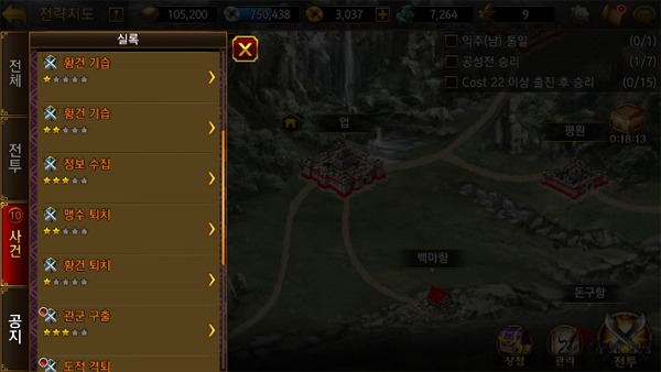 기본적으로 원작과 같은 방식의 연의가 제공되고, 별도로 사건과 모의전 등을 플레이할 수 있는 전략모드가 있죠. 1차 CBT때는 이런걸 왜 굳이 붙여놨을까 하는 생각이 들었는데 2차 CBT때는 확실히 다른 모습으로 다가오더라구요.