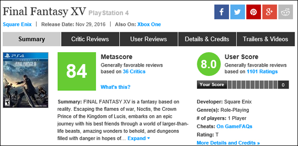 1일 현재 파이널판타지15는 공신력 높은 해외 게임 평가 사이트 ‘메타크리틱’에서 메타 점수 84점과 유저 점수 8.0점을 기록 중이다. 호불호가 크게 갈린 출시 전 상황에 비하면 평점은 매우 양호한 편이다.