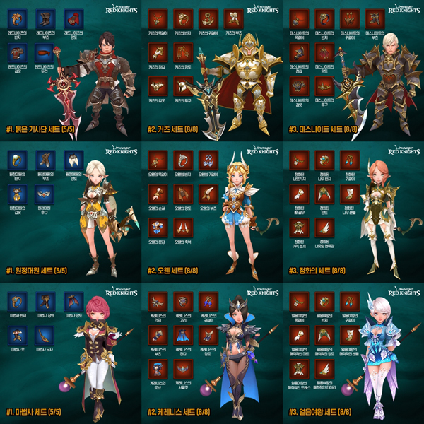 레드나이츠에 존재하는 장비 중 일부는 세트를 구성하기도 한다. 세트 아이템은 일정 갯수가 모이면 추가적인 능력치를 주기 때문에 일반적인 장비보다 더욱 강력한 힘을 발휘할 수 있다.