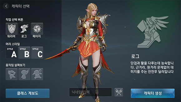 엘프 종족은 빠른 공격속도와 많은 타격 수로 콤보 시스템에 최적화 됐다. 전직을 통하여 그 특성을 더욱 강화시킬 수 있다.