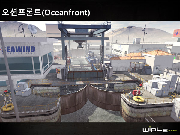오션프론트는 비대칭 맵으로 주로 실내에서 전투가 벌어진다. 게임 시작과 동시에 배가 맵 중앙으로 들어오면서 1차적으로 중앙 전장이 변형된다. 배 도착 후 크레인이 움직여 배 위에 있는 컨테이너를 들어올리며 2차 변형이 진행된다.