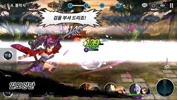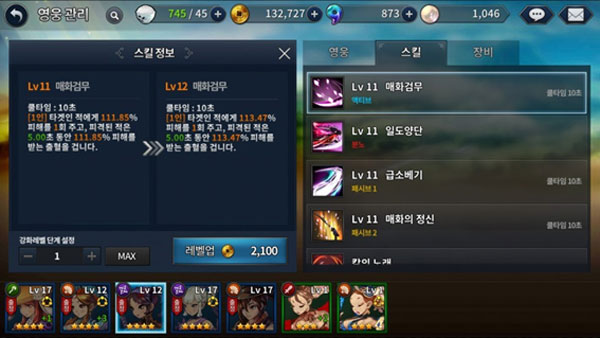 각 스테이지에서 전투를 치를 때마다 화려한 연출로 스크린을 수놓는 것은 바로 영웅들의 스킬이다. 이 스킬을 강화함으로써 더욱 빠르게 스테이지 클리어를 할 수 있다.