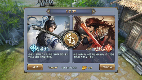 세 번째로 '진영전'이 있다. 매주 일요일, 유저들은 '창운회'와 '연화교' 두 진영으로 나뉘어 대규모 대전을 벌인다. 50대 50 전장 4구역으로 나뉘며, 승패 뿐 아니라 처치한 수 등으로 점수를 매겨서 최종 승자를 가린다. 방파전에서 승리한 방파장이 일주일 간 맹주가 돼 10명 내외로 직책을 임명할 수 있다. 그 외는 선착순이며 승리한 진영 전체 유저에게는 보상이 주어진다. 참여자 중 좋은 결과를 내면 보상과 다음 진영전까지 유지되는 칭호를 받을 수 잇는데, 특히 칭호에는 능력치 상승 효과가 있다.