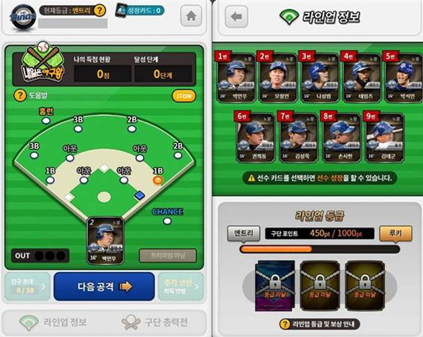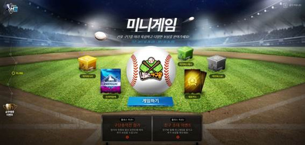 미니 게임 요소는 현재 진행 중인 사전예약 페이지를 통해서 맛볼 수 있다. 사전예약을 신청한 이용자들이라면 누구나 ‘내일은 야구왕’ 미니게임을 즐길 수 있다. 이용자들은 아래 창에 있는 ‘라인업 정보’를 통해 선수들을 레어, 레귤러, 엘리트, 올스타 등 점차 더 높은 등급으로 성장시켜 득점의 가능성을 높일 수 있다.