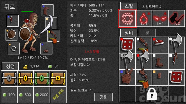 장비 장착 및 스킬 시스템도 눈여겨 볼만하다. 전투 중에는 각종 장비를 획득할 수 있으며 이를 장착해 캐릭터를 더욱 강력하게 만든다. 장비는 다양한 등급으로 나눠져 있으며 무작위 부가 효과가 부여돼 있다. 또, 레벨업을 할 때마다 주어지는 스킬 포인트로 새로운 스킬을 배우거나 기존 스킬을 강화하는 것도 가능하다.