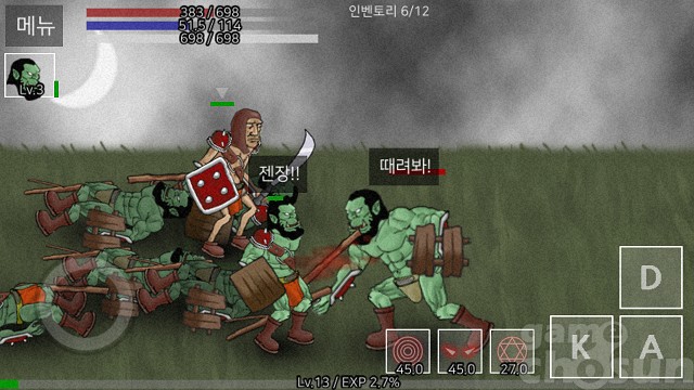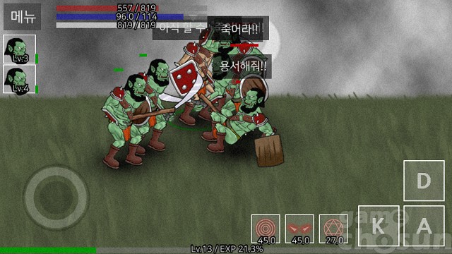 게임의 조작은 간단하다. 좌측에는 캐릭터를 움직일 수 있는 가상 조이스틱이 있으며 우측에는 D/A/K키와 스킬이 배치돼 있다. D키는 Defence의 약자로 방패를 들어서 상대의 공격을 막을 수 있고, A키는 Attack의 약자로 공격하는 동작이다. 마지막으로 K키는 Kick이며 상대의 가드를 무너뜨리거나 넘어뜨려 무방비로 만들 수 있다.