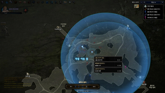 미니맵에서는 자신의 퀘스트 지역과 범위를 자세히 표기해주며, 맵을 열어 마우스 우클릭을 하면 먼 지역도 자동으로 이동한다.