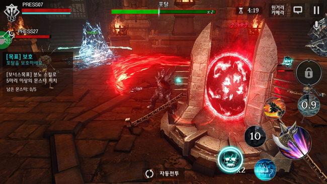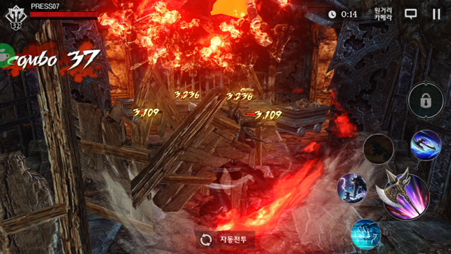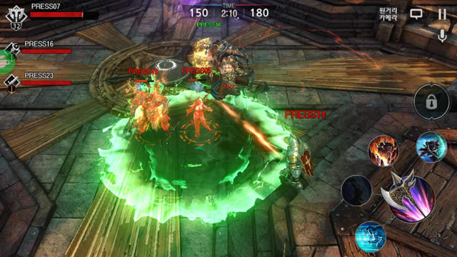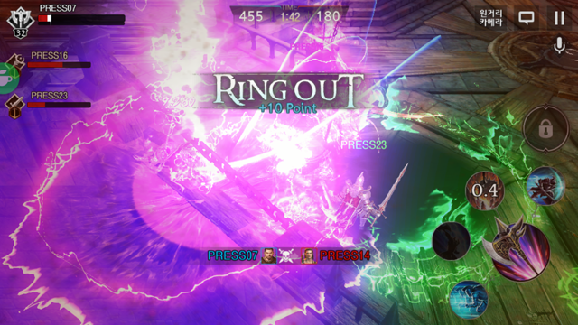 대전모드는 주로 PVP(이용자간대결) 콘텐츠로, 1대 1, 3대 3 대전이다. 대부분의 모바일 액션 RPG처럼 스킬이 정확하게 들어갔는지 식별할 수 없는 점은 조금 아쉬웠다.