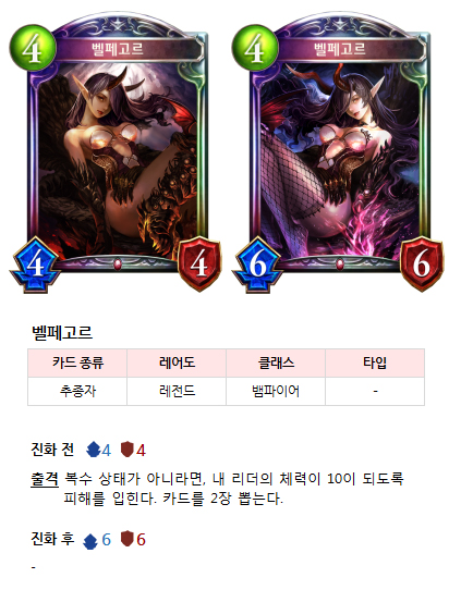 그 중 레전드 카드인 '벨페고르'와 '폭풍의 뱀' 역시 뱀파이어의 콘셉트 기존 콘셉트를 더욱 강화하며 새로운 활로를 열어줄 것으로 기대를 받고 있다.
