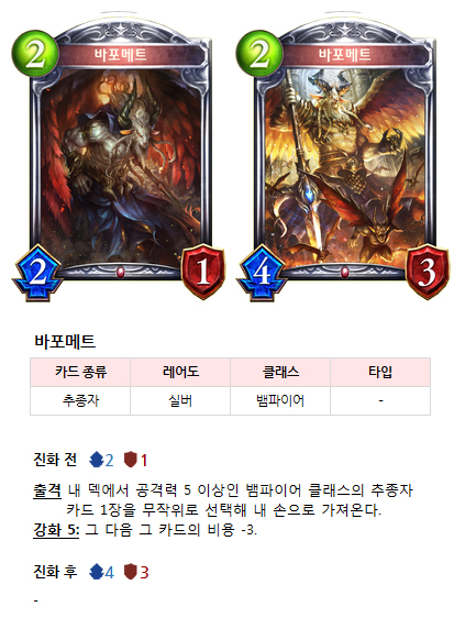 공격력이 5라는 점도 주목받는다. 신들의폭풍에서 등장하는 뱀파이어 실버 카드 중 하나인 '바포메트'는 출격 효과로 덱에서 공격력 5이상의 뱀파이어 클래스 카드 1장을 손에 더할 수 있는 효과를 가지고 있다. 특히, 강화5 효과로 출격 시 가져온 카드의 비용을 5로 낮추는 효과를 가지고 있다.