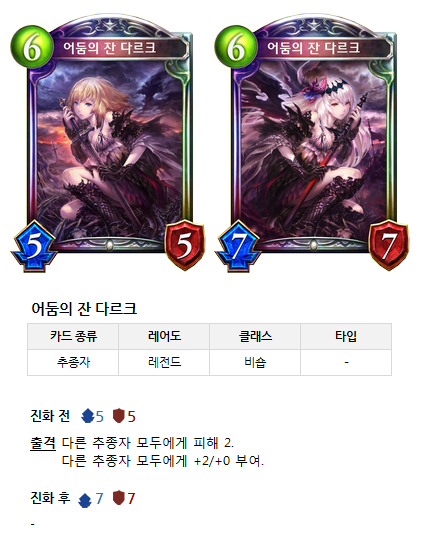 어둠의 잔 다르크는 6코스트에 5/5라는 준수한 능력치를 가진 추종자다. 이 카드는 출격 시 자신을 제외한 다른 모든 추종자에게 2의 피해를 주고, 공격력을 2 올려주는 독특한 효과를 가지고 있다.