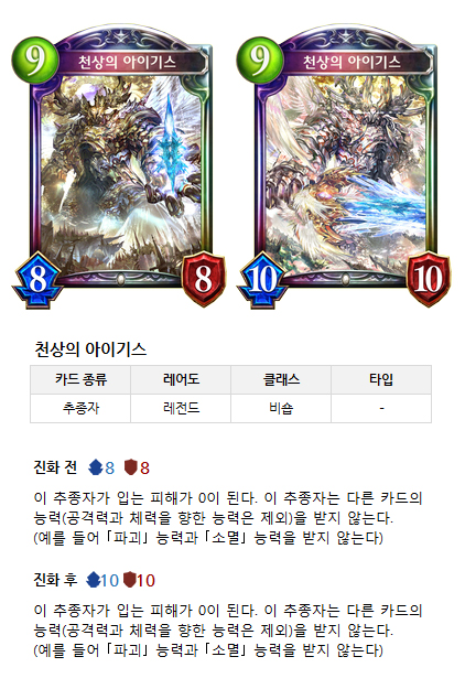 천상의 아이기스는 소멸 외에 제거 방법이 전무한 네크로맨서의 '모르데카이'와 유사한 추종자다. 이 카드는 9코스트로 최후반에 등장하는 추종자로 8/8이라는 강력한 능력치를 보유하고 있다.