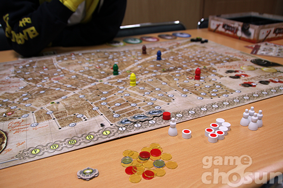경관 마커까지 모두 깔리면 희생자 마커를 모두 뒤집어 확인 후, 빨간색표시가 있는 곳에 희생자 토큰을 올려두고 게임을 시작한다.