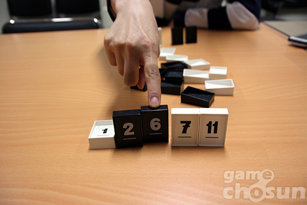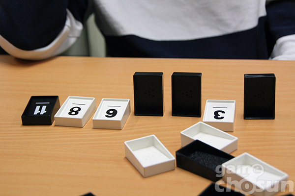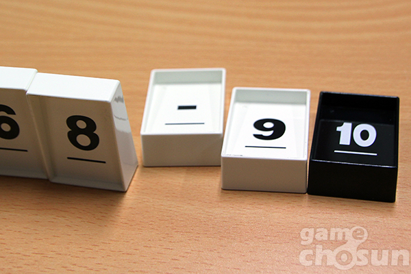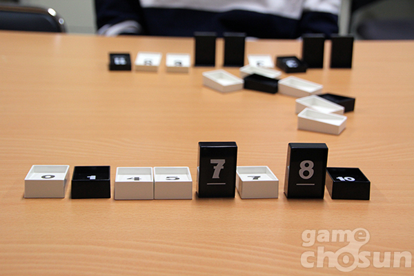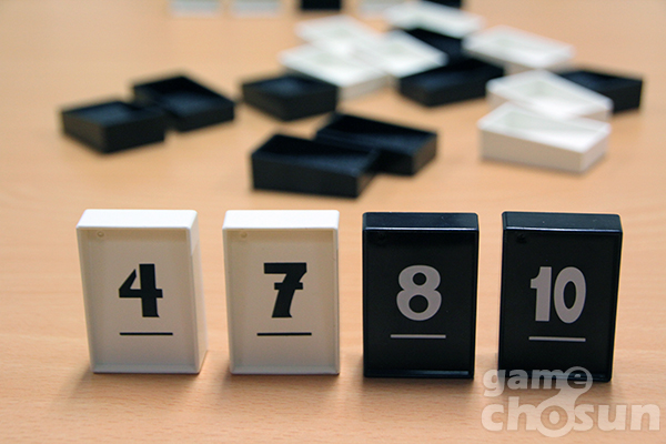 예를 들어 4와 7, 8, 10을 집었다면, 아래의 사진처럼 숫자 순서대로 배치하면 된다. 이후, 번갈아가면서 추리를 하게 된다. 추리를 하기전에 우선 바닥에 깔려있는 블록을 하나 가져온 후, 위의 규칙에 맞춰 가져온 블록을 배치한다. 그리고 난 후, 상대의 블록을 하나 선택하고 숫자를 선언한다.