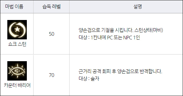 이는 기사의 주력 스킬인 쇼크 스턴과 카운터 배리어가 양손검 전용 스킬이고 최상급 양손검에는 스턴 적중 증가 옵션이 부여되어 서로 간에 시너지가 좋다. 기사는 결국 상위 장비를 맞출수록 양손검 세팅으로 굳혀진다.