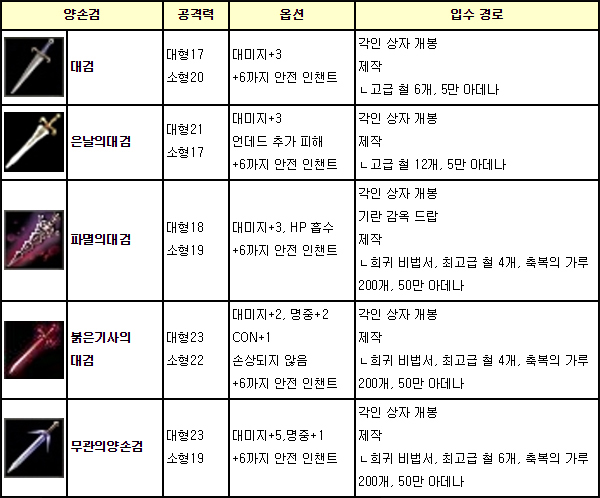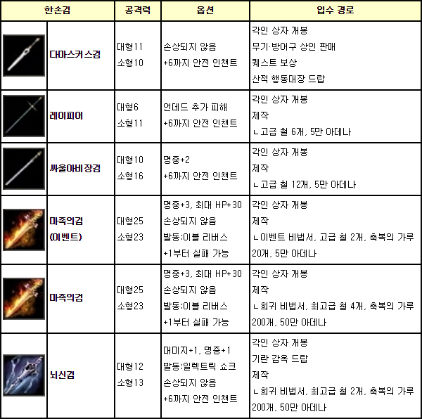 - 한손검: 다마스커스 검 - 레이피어 - 싸울아비 장검/마족의 검 - 뇌신검