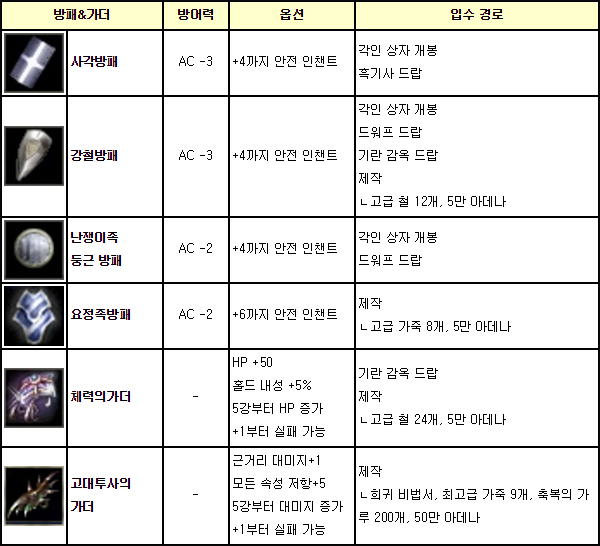 기사의 주력 방패인 사각 방패와 강철 방패는 사냥이나 각인 상자, 제작으로 쉽게 획득할 수 있으나 체력의 가더와 고대 투사의 가더는 제작으로만 입수할 수 있고 제작비가 비싸다.