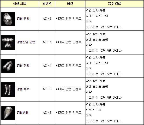 입수하기 쉬운 강철 세트는 기본 물리 방어력이 높고 4강까지 안전 인챈트가 가능하다. 또 투구와 갑옷, 장갑, 부츠, 방패 다섯 부위로 구성되어 있으며 풀세트 장착 시 세트 효과로 AC -3이 적용된다.
