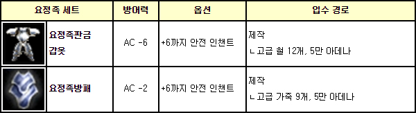 제작으로 얻는 요정족 판금 갑옷과 요정족 방패 두 부위이며 강철 판금 갑옷, 강철 방패보다 기본 물리 방어력(AC)이 1 낮지만, 6강까지 안전하게 인챈트할 수 있다. 무게가 가볍다는 것도 강점이다. +4 강철 판금 갑옷(AC -11)과 세트 효과(AC -3)를 포기하는 대신 +6 요정족 판금 갑옷(AC -12)을 장착하는 셈이다.
