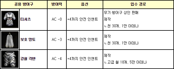 티셔츠와 망토, 각반은 공용 방어구 부위로 4강까지 안전 인챈트로 물리 방어력(AC)을 -19 이상 향상할 수 있다.