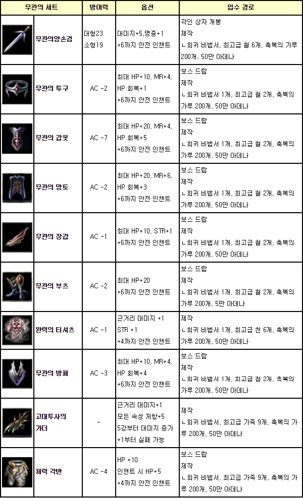 무관의 세트는 희귀 제작 비법서로 제작해 입수하는 기사의 최상위 장비다. 높은 공격력과 추가 대미지의 무관의 양손검은 물론이고, 높은 물리 방어력(AC)과 마법 저항(MR), HP 증가 등 다양한 옵션이 부여된 무관의 방어구 세트는 +6강까지 안전하게 인챈트할 수 있어 높은 공격력과 방어력을 기대할 수 있다.