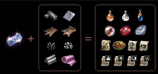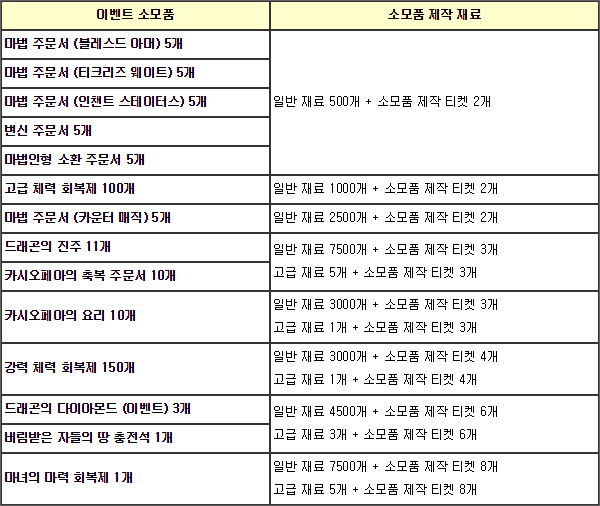또 매일 우편을 통해 지급하는 '소모품 제작 티켓' 10장으로 드래곤의 진주와 카시오페아의 주문서/요리, 버림받은 자들의 땅 충전석 등 유용한 소모품을 제작할 수 있다.