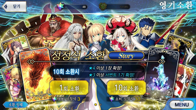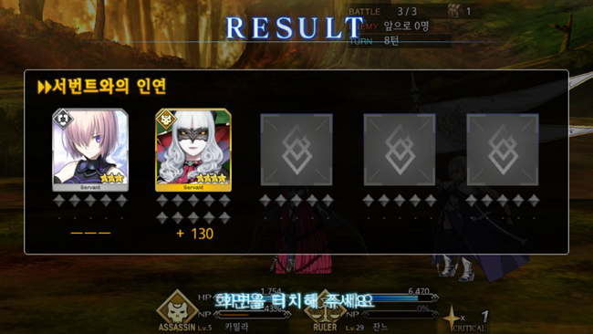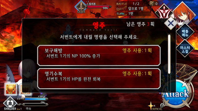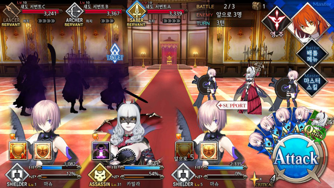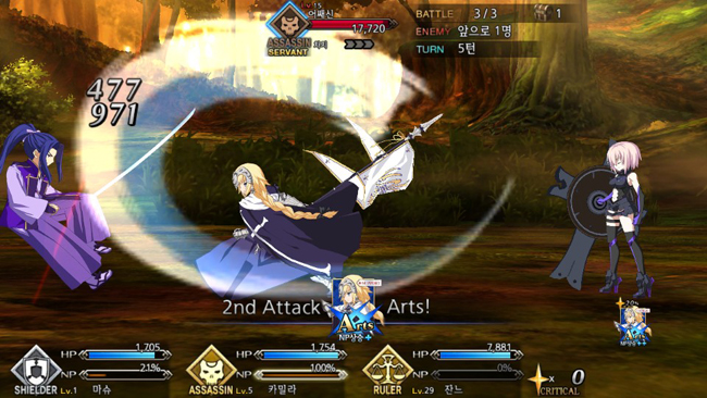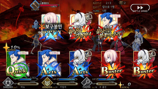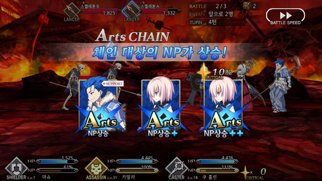 커맨드 카드의 종류는 크게 3가지다. 대미지가 강화되는 ‘버스터’, 획득 NP를 높여주는 ‘아츠’, 크리티컬 스타 양을 늘리는 ‘퀵’ 등이다. 캐릭터가 NP를 100% 채우면 일종의 궁극기인 보구 카드가 추가로 개방된다. 전투 중 획득하는 크리티컬 스타는 다음 턴 공격의 크리티컬 확률을 높여 준다.