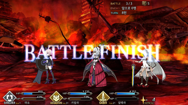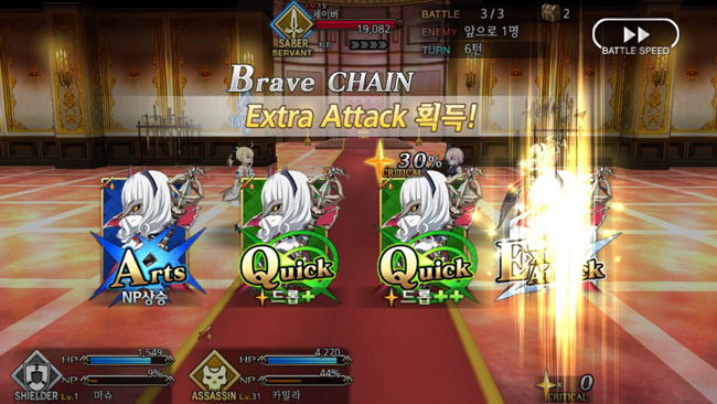 커맨드 카드를 조합할 때 같은 캐릭터가 3연속 공격하면 4번째 공격이 자동으로 나간다. 같은 효과의 카드 세 장을 사용하면 추가 효과를 얻는다. 공격력을 높일 것인지, NP를 모을 것인지, 크리티컬 스타 드롭을 높일 것인지 전략적인 선택은 필수다.