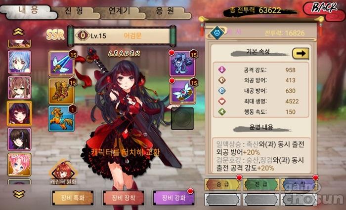 진형 메뉴에서는 전투에 출전할 캐릭터와 위치를 지정할 수 있다. 최대 6인 무림 소녀가 전투 전방에 나선다.