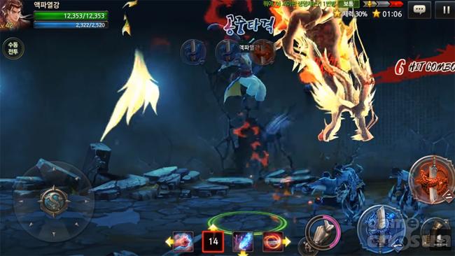 민기홍 PD : 횡스크롤 액션게임 장르라 조작이 아무래도 다른 게임보다는 코어한 편이다. 액션 버튼 두 개와 스킬 슬라이드 방식의 버튼이 4개, 연속기를 포함하면 38~40종 가량 스킬을 조합해 사용할 수 있다. 모바일에서 조작을 힘들어 하는 이용자를 위해서는 학습 단계에 따라 반(半) 오토, 오토 플레이를 지원한다. 수동 조작은 콤보 연습장을 통해 디테일하게 학습할 수 있도록 했다. 최종 단계에서는 코어하지만 쉽게 극복하는 시스템을 마련하고자 했다.