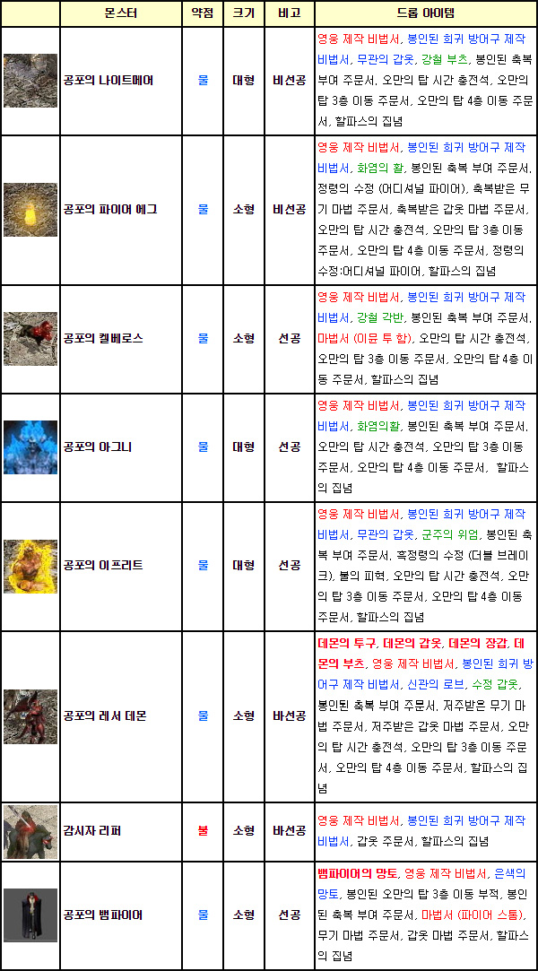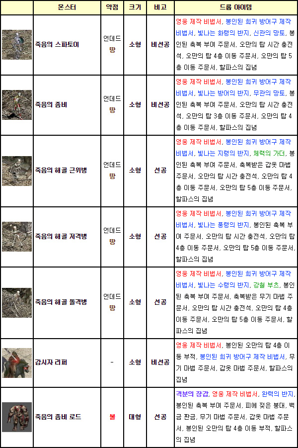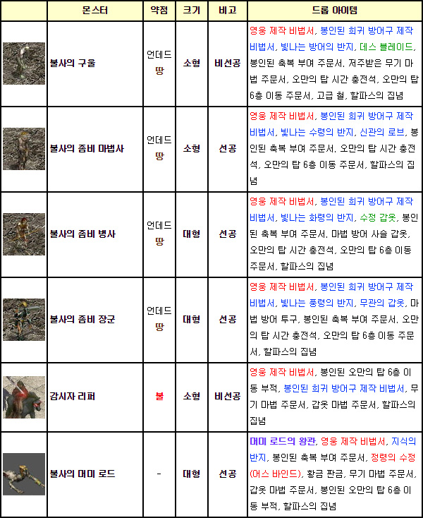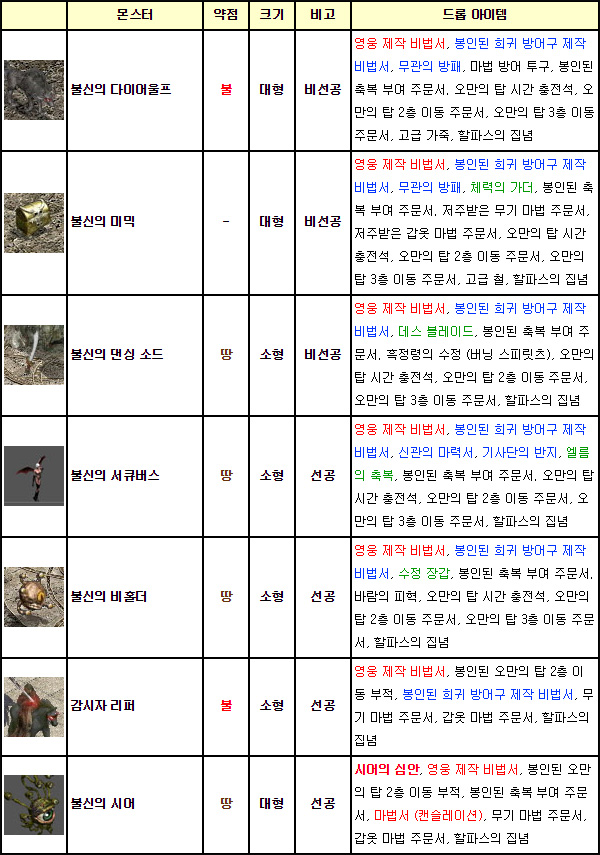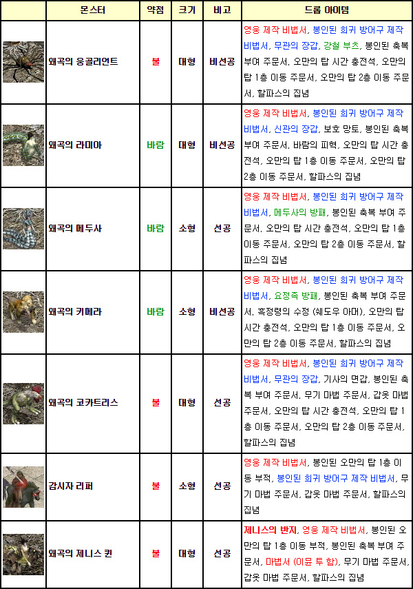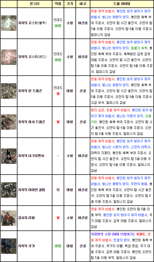 오만의 탑 4~6층 몬스터 정보와 이들이 드랍하는 아이템은 아래와 같다.
