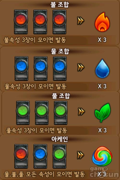 카드 색상으로 해당 카드의 속성을 알 수 있다. 직관적으로 확인할 수 있도록 불(빨강), 물(파랑), 풀(초록)의 3가지 속성으로 나뉘어 있다. 각 속성별로 같은 색 3장은 3배의 데미지가 적용되며, 각 속성별로 한 장씩의 카드가 조합될 때에도 3배의 대미지가 적용된다.