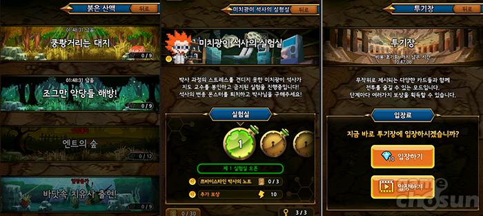 붉은 산맥(왼쪽), 미치광이 석사의 실험실(가운데), 투기장(오른쪽) 이미지 스마일게이트메가포트 제공