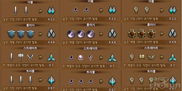 ‘아케인스트레이트’에서 가장 큰 공격 배수는 같은 직업의 카드 3장이 모이는 것으로 9.7배에 해당한다. 또한 한 계열의 모든 직업을 모으거나 같은 계열의 카드를 모았을 때 등도 높은 배수의 피해를 적에게 가할 수 있다.