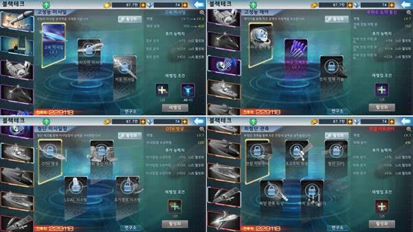 블랙테크는 함대가 25레벨이 되면 오픈되고, 미사일, 레이더, 동력, 통신, 제어 등에 대해서 확인해 각각의 기술을 활성화하거나 레벨을 올려서 함대의 전투력을 올려줄 수 있는 시스템이다.