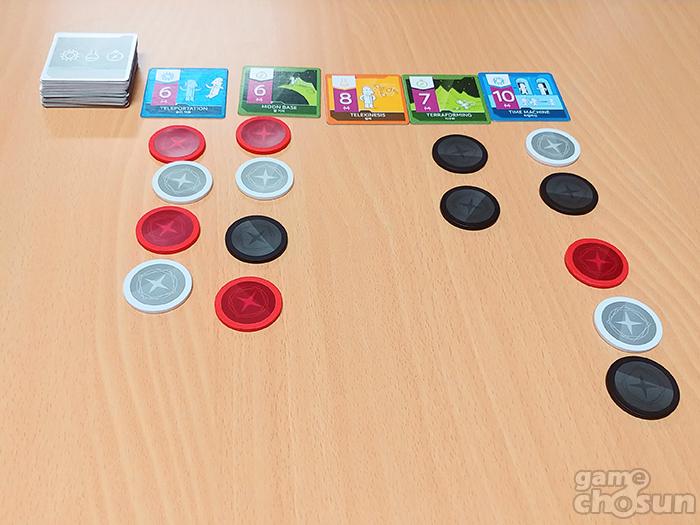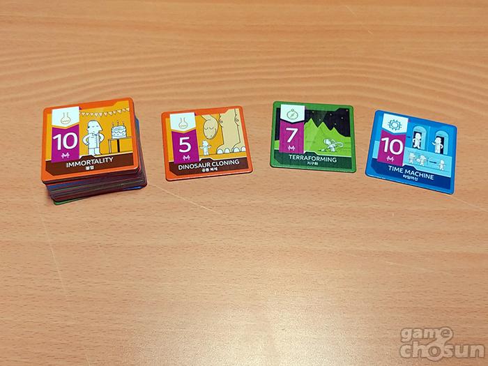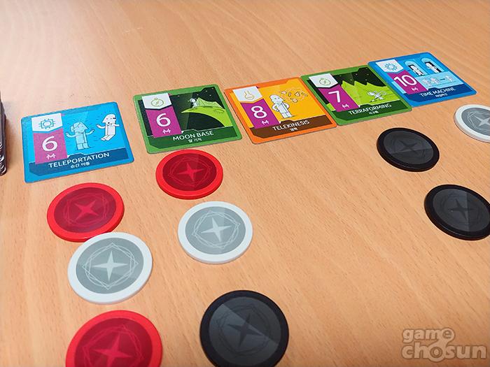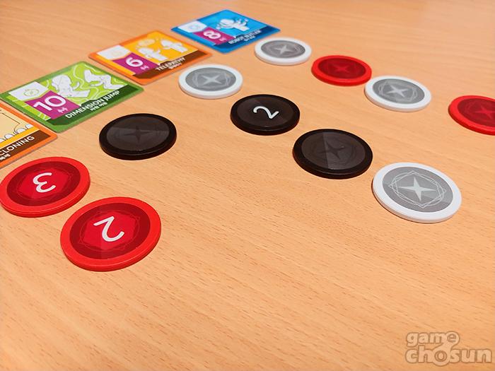 벤처엔젤스의 가장 큰 특징은 투자칩의 개수가 투자점수를 보장해주지 않는다는 점이다. 아무리 많은 투자칩이 들어가도 모두 1짜리라면 벤처가 실패할 수 있고, 2개만 들어가도 당장 5점을 넘어버리면서 투자가 성공할 수 있다.