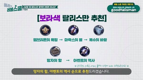 최종 단계 탈리스만 뿐만 아니라 거쳐가면서 쓰기 좋은 탈리스만도 소개해주고 있는 모습 = 플라의 레볼스쿨 캡처