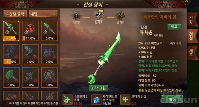 또한, 전설 무기는 별도의 업그레이드를 통해 그 성능이 1단계에서 128레벨 무기로, 2단계에서 152레벨, 3단계에서 188레벨까지 계속해서 성장하는 무기다. 업그레이드를 위해서는 '전설 무기 조각'과'자이언트 드래곤 수정' 을 일정량 필요로 하고, '고대의 심장'도 단계에 따라 여러 개 소모하여 단계적으로 성장시킬 수 있다.