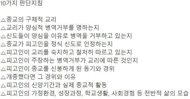 이에 지난해 12월3일 대검찰청은 전국 각 검찰청에 병역법 위반 혐의로 재판을 받는 양심적 병역거부자들의 주장이 정당한 병역거부 사유에 해당하는지를 판단하기 위한 10가지 지침을 일선 검찰청에 배포했다.