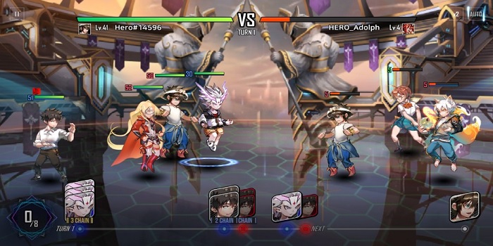 마지막으로 아레나가 있다. 아레나는 자신의 캐릭터를 다른 플레이어의 캐릭터와 싸워보는 일종의 PvP 개념이다. 다만, 실시간으로 진행되는 것이 아니라 각 플레이어가 방어파티로 설정해둔 파티와 자신의 공격파티가 전투를 벌이는 개념이다. 상대의 전투력과 등급을 보고 전투를 결정할 수 있기 때문에 유리하게 전투에 참여할 수 있다.