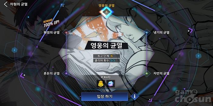 5종류의 균열 중 원하는 곳을 입장할 수 있다. = 게임조선 촬영