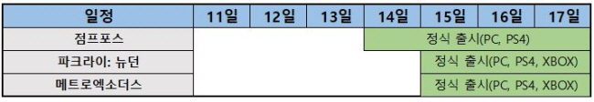 '파크라이: 뉴던'은 전작 '파크라이5'에서 다소 실망스런 모습을 보였던 만큼 신작에서는 어떤 평가를 받을지 기대되고 있다. 또한 '메크로: 엑소더스'의 경우에도 스팀 사전예약을 중단시키며 단독 출시작으로 삼은 만큼의 가치가 있었는지를 평가 받을 것으로 보인다.