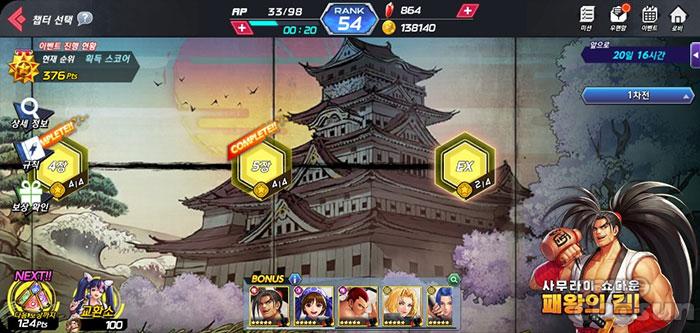 특이한 점은 각 지역을 클리어할 때마다 스코어와 이벤트 코인을 제공한다는 점이다. 기본 점수는 고정되어 있지만, 사무라이쇼다운 캐릭터를 팀 또는 스트라이커로 배치하거나 사무라이쇼다운 배틀카드를 착용하면 추가로 획득할 수 있다.